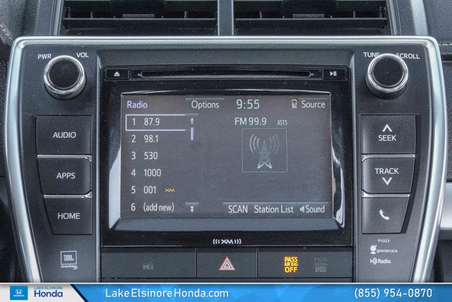 Lake Elsinore Honda is proud to present this Toyota Camry equipped with the following features: ABS brakes, Alloy wheels, Electronic Stability Control, Front dual zone A/C, Heated door mirrors, Heated front seats, Illuminated entry, Low tire pressure warning, Remote keyless entry, Traction control, 10 Speakers, 4-Wheel Disc Brakes, 7.5J x 18" Alloy Wheels, Air Conditioning, AM/FM radio: SiriusXM, Automatic temperature control, Brake assist, Bumpers: body-color, CD player, Delay-off headlights, Driver door bin, Driver vanity mirror, Dual front impact airbags, Dual front side impact airbags, Exterior Parking Camera Rear, Four wheel independent suspension, Front anti-roll bar, Front Bucket Seats, Front Center Armrest, Front reading lights, Fully automatic headlights, Knee airbag, Leather steering wheel, Multi-Stage Heated Front Bucket Seats, Occupant sensing airbag, Outside temperature display, Overhead airbag, Overhead console, Panic alarm, Passenger door bin, Passenger vanity mirror, Power door mirrors, Power driver seat, Power passenger seat, Power steering, Power windows, Radio: Entune Audio Plus w/Connected Nav/JBL Audio, Rear anti-roll bar, Rear seat center armrest, Rear side impact airbag, Rear window defroster, Speed control, Speed-sensing steering, Split folding rear seat, Spoiler, Sport Leather-Trimmed Ultrasuede Seat Trim, Sport steering wheel, Steering wheel mounted audio controls, Tachometer, Telescoping steering wheel, Tilt steering wheel, Trip computer, and Variably intermittent wipers.