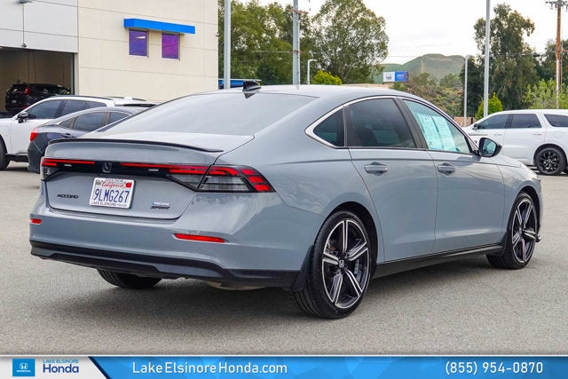 Lake Elsinore Honda is proud to present this Honda Accord Hybrid equipped with the following features: 2.0L 16V DOHC, 4-Wheel Disc Brakes, 8 Speakers, ABS brakes, Adaptive Cruise Control: Adaptive Cruise Control (ACC) with Low-Speed Follow, Air Conditioning, Alloy wheels, AM/FM radio, Apple CarPlay/Android Auto, Auto High-beam Headlights, Automatic temperature control, Blind Spot Information (BSI) System warning, Brake assist, Bumpers: body-color, Compass, Delay-off headlights, Driver door bin, Driver vanity mirror, Dual front impact airbags, Dual front side impact airbags, Electronic Stability Control, Emergency communication system: HondaLink, Exterior Parking Camera Rear, Fabric Seat Trim, Four wheel independent suspension, Front anti-roll bar, Front Bucket Seats, Front Center Armrest, Front dual zone A/C, Front reading lights, Fully automatic headlights, Illuminated entry, Knee airbag, Lane departure: Lane Keeping Assist System (LKAS) active, Leather Shift Knob, Leather steering wheel, Low tire pressure warning, Occupant sensing airbag, Outside temperature display, Overhead airbag, Overhead console, Panic alarm, Passenger door bin, Passenger vanity mirror, Power door mirrors, Power driver seat, Power moonroof, Power steering, Power windows, Radio data system, Radio: 180-Watt Audio System, Rear anti-roll bar, Rear reading lights, Rear seat center armrest, Rear side impact airbag, Rear window defroster, Remote keyless entry, Security system, Speed control, Speed-sensing steering, Speed-Sensitive Wipers, Split folding rear seat, Spoiler, Steering wheel mounted audio controls, Telescoping steering wheel, Tilt steering wheel, Traction control, Trip computer, Variably intermittent wipers, and Wheels: 19" x 8.5J Berlina Black.