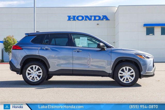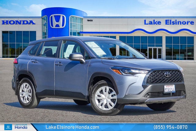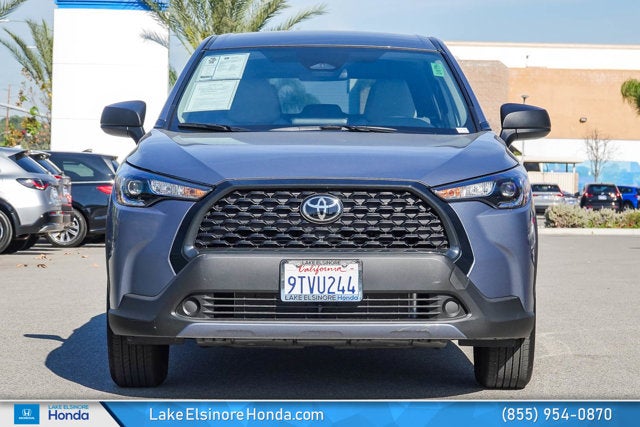 Lake Elsinore Honda is proud to present this Toyota Corolla Cross equipped with the following features: 4-Wheel Disc Brakes, 6 Speakers, ABS brakes, Air Conditioning, AM/FM radio: SiriusXM, Auto High-beam Headlights, Brake assist, Bumpers: body-color, Delay-off headlights, Driver door bin, Driver vanity mirror, Dual front impact airbags, Dual front side impact airbags, Electronic Stability Control, Emergency communication system: Safety Connect (10-year trial), Exterior Parking Camera Rear, Fabric Seat Trim, Front anti-roll bar, Front Bucket Seats, Front Center Armrest, Front reading lights, Front wheel independent suspension, Heated door mirrors, Illuminated entry, Knee airbag, Low tire pressure warning, Occupant sensing airbag, Outside temperature display, Overhead airbag, Panic alarm, Passenger door bin, Passenger vanity mirror, Power door mirrors, Power steering, Power windows, Radio data system, Radio: 8" Toyota Audio Multimedia with 6 Speakers, Rear anti-roll bar, Rear side impact airbag, Rear window defroster, Remote keyless entry, Speed control, Split folding rear seat, Spoiler, Steering wheel mounted audio controls, Tachometer, Telescoping steering wheel, Tilt steering wheel, Traction control, Trip computer, and Wheels: 17" Steel with Silver Covers.